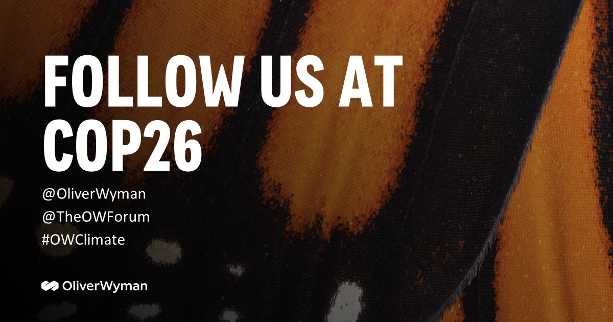 Oliver Wyman is proud to be a research partner at Climate Week NYC 2021. Hosted annually by international non-profit the Climate Group in conjunction with the United Nations, and in partnership with the COP26 and the City of New York, Climate Week NYC is a global opportunity to come together to accelerate climate action and assess progress ahead of COP26. This year's focus is on fulfilling and increasing commitments made by businesses, governments, and organizations.