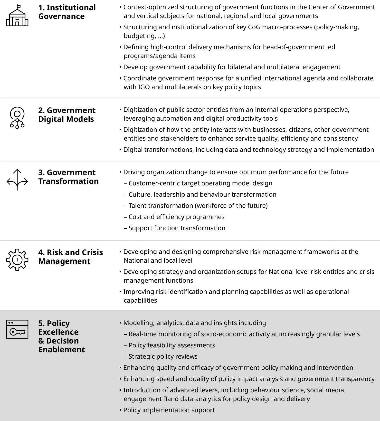We have global expertise and experience in delivering public sector excellence. This work is spread over four key topics. Each of these topics is highly relevant for public sector institutions globally, with a wealth of underlying capabilities and toolkits supporting the delivery of high-impact work.