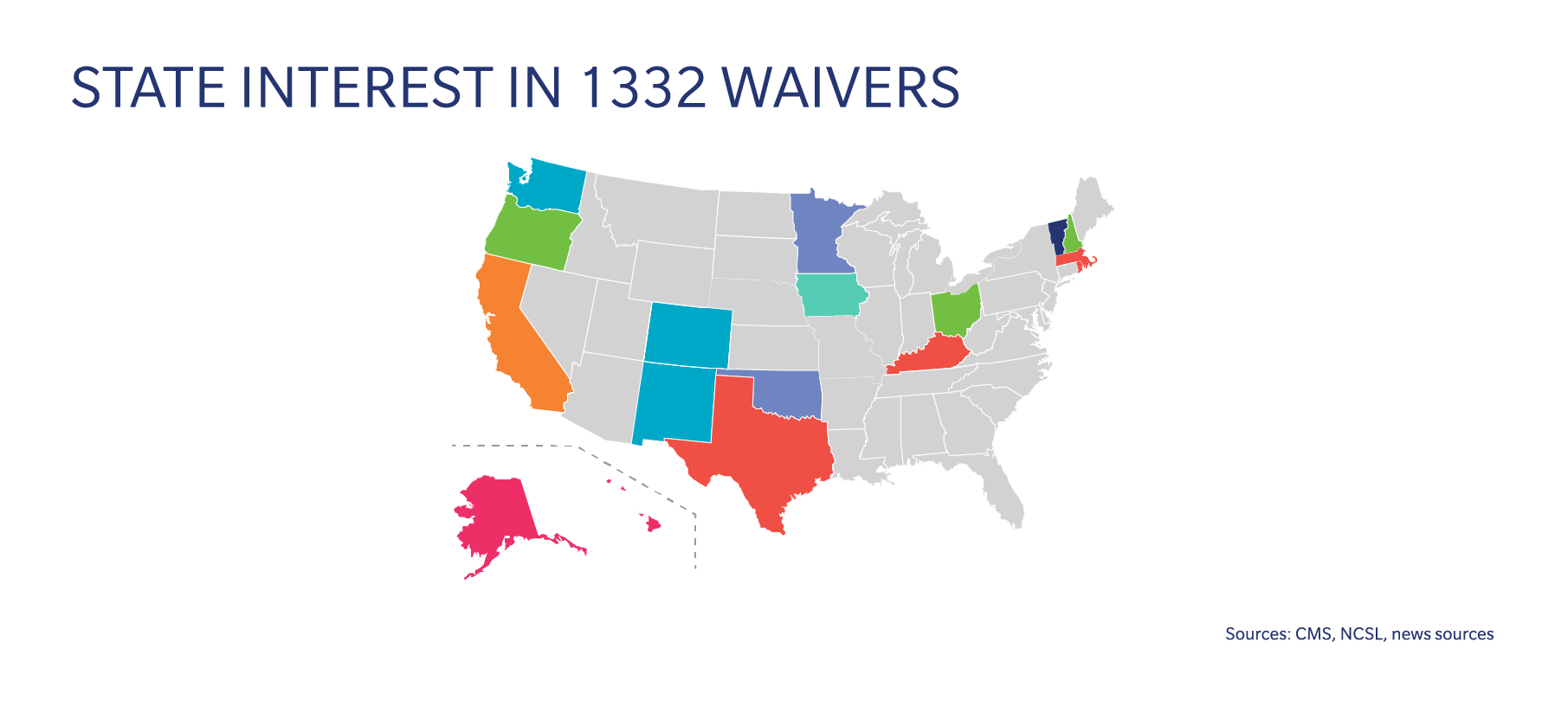 Fourteen states so far have passed 1332 legislation. The states are pursuing a variety of strategies via their waivers and are in varying stages of the process. Alaska’s waiver is based on federal support for a state-managed reinsurance program. The rationale behind their waiver is that relieving payers of costs associated with high-risk individuals will serve to reduce premiums in the individual market. Under the waiver, the federal government will contribute (roughly) the amount it will “save” on premium subsidies to the State’s new reinsurance program. (Read more about Alaska’s 1332 waiver here.)