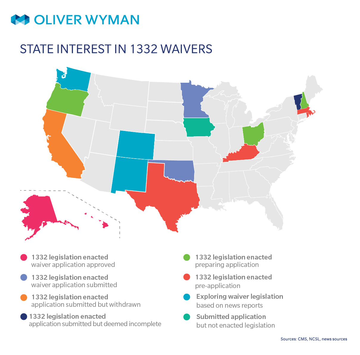 Minnesota, Oklahoma, Oregon, and New Hampshire have all passed 1332 legislation and are in the process of preparing their waiver applications. Each state is using an approach similar to Alaska’s, and are making implementation of the program contingent upon approval of the waiver application.